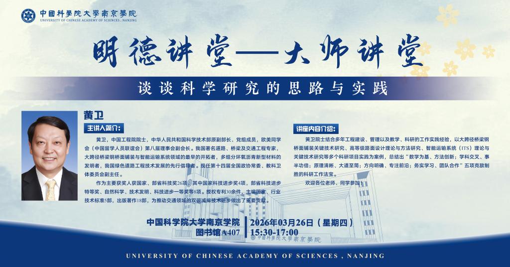 报告讲座 首页 - 报告讲座 - 正文 【明德讲堂】黄卫:谈谈科学研究的思路与实践 讲座日期 2026-03-26 15:30:00 主讲人:黄卫 院士 主 题:谈谈科学研究的思路与实践 时 间:2026年03月26日(星期四)15:30-17:00 地 点:国科大南京学院 图书馆A407